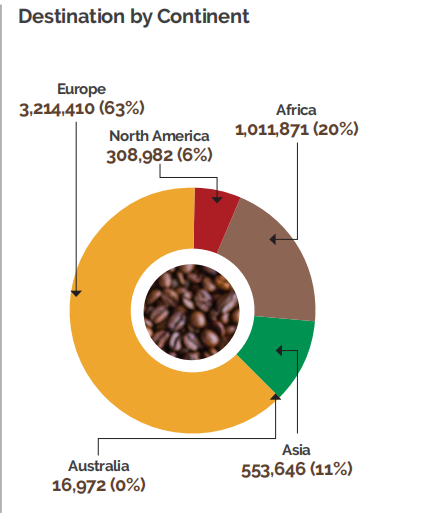 2019-2020财政年度,乌干达出口咖啡511万袋,价值4.96亿美元。2020-2021财政年度,出口超过600万袋,出口额为5.59亿美元,创下了30年来的最高出口记录。