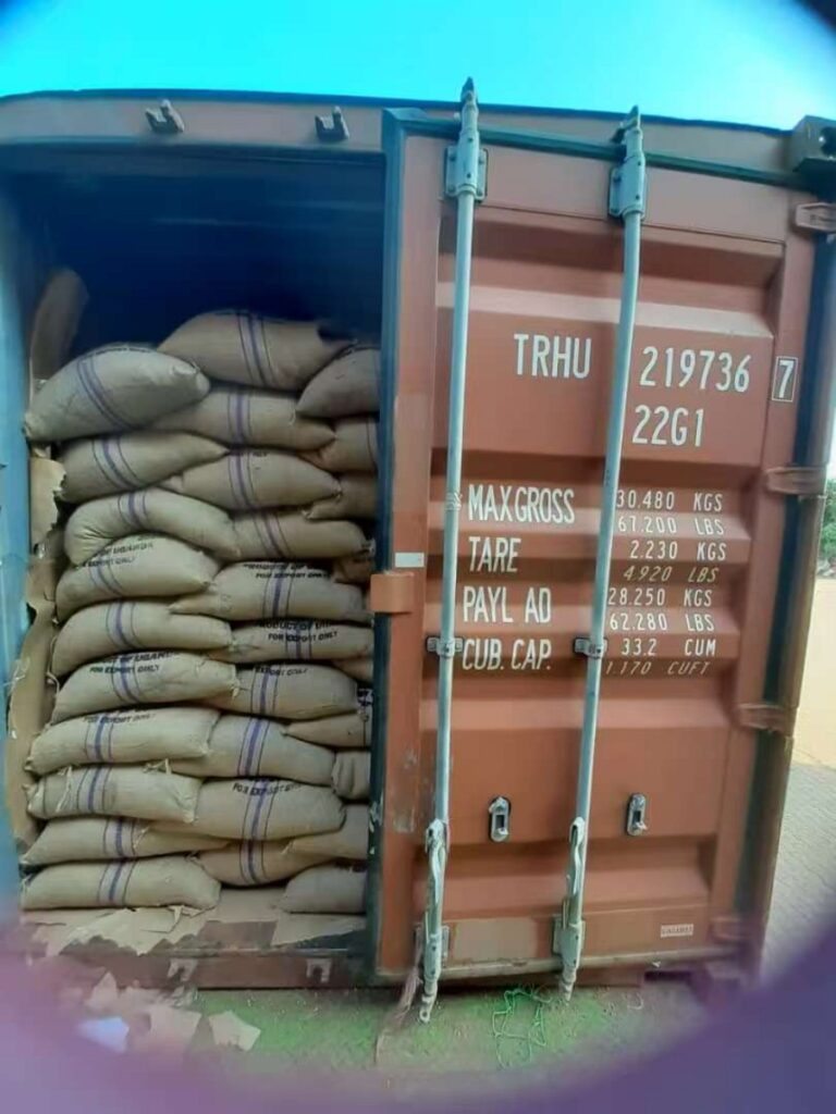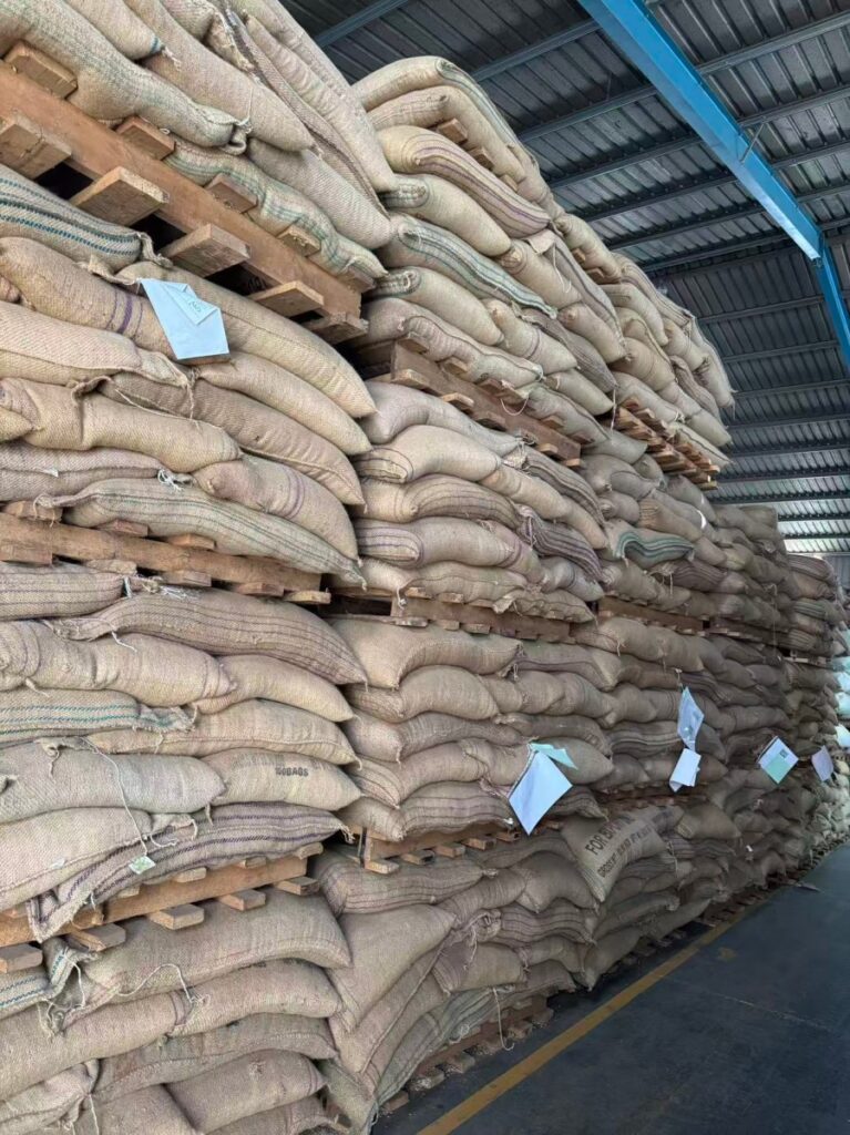 完成筛选后的咖啡豆,将用黄麻袋分装作为出库\出口包装,每袋60公斤,将其装入货柜以运输到港口。